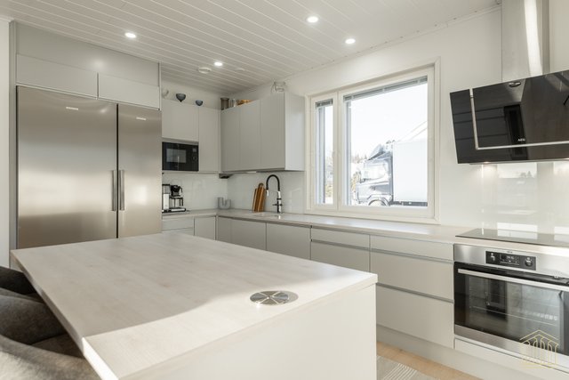- Side-by-side jääkaappipakastin, erillisuuni, mikroaaltouuni (integroitu), liesi, liesituuletin, astianpesukone (integroitu), ja keittiösaareke