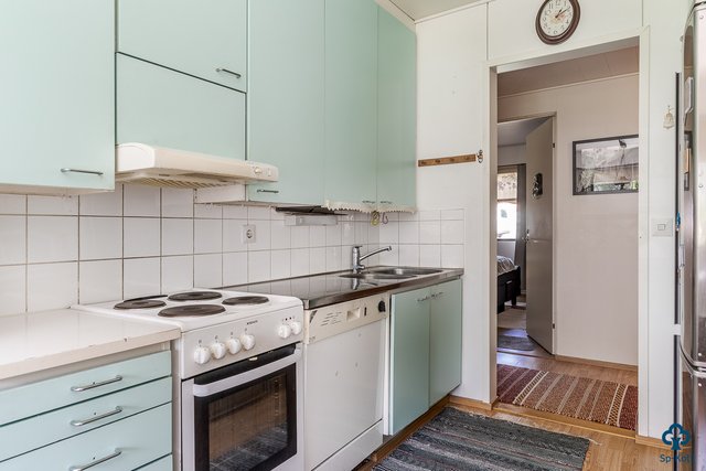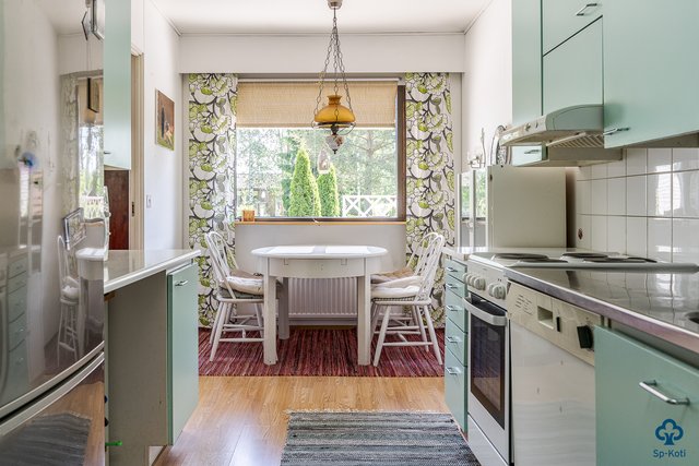 - Jääkaappipakastin, sähköliesi, liesituuletin, astianpesukone. Laminaattitaso, laminaattilattia, seinät maalattu.