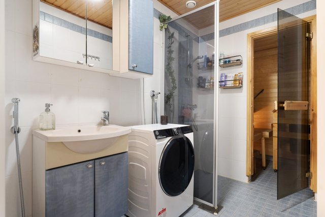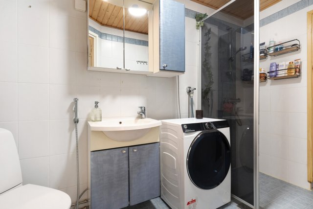 - WC-istuin, suihku, suihkuseinä, pesukoneliitäntä, lattialämmitys, bidee-suihku, allaskaappi, pesuallas, ja peilikaappi