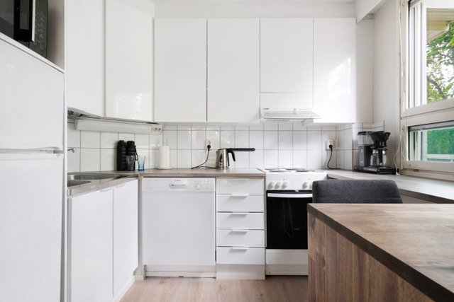 - Jääkaappipakastin, uuni, liesi, liesituuletin, ja astianpesukone