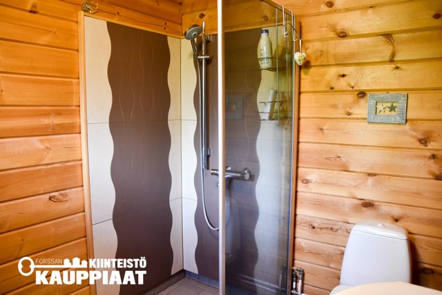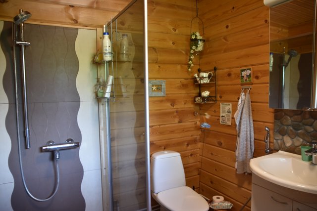 - Pesuhuone osin laatoitettu+ hirsipaneeli, suihku, wc istuin ja käsienpesulavuaari.