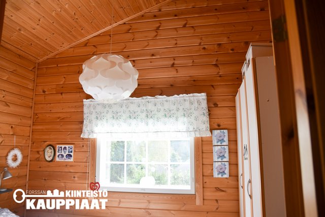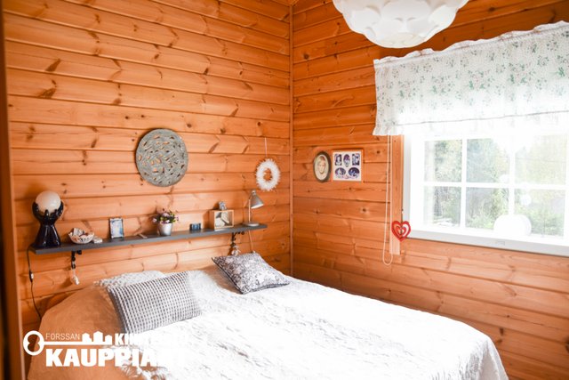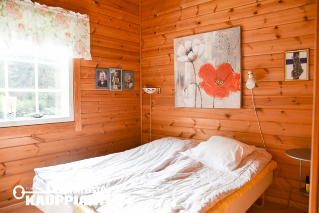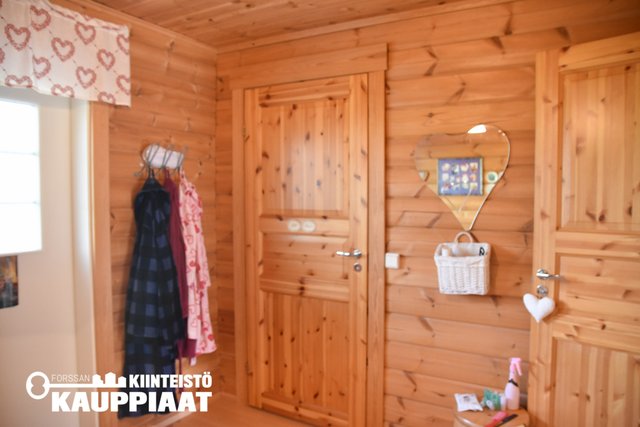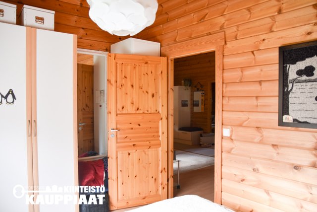 - Myös molemmissa makuuhuoneissa laminaattilattia ja hirsipaneelit seinissä. Pesuhuoneeseen mentäessä on vierashuone, jossa samat materiaalit.
