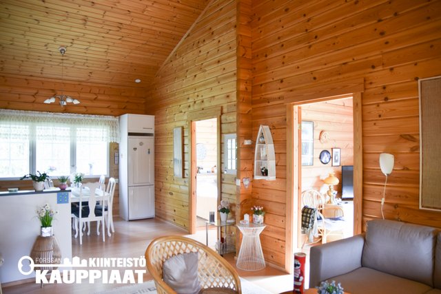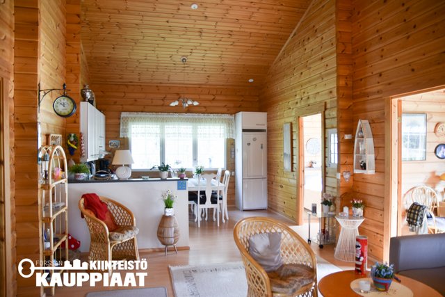 - Iso olohuone, korkeat katot. laminaattilattiat ja hirsipaneelit seinissä, paneloitu katto. Koko rakennuksessa on lattialämmitys.
