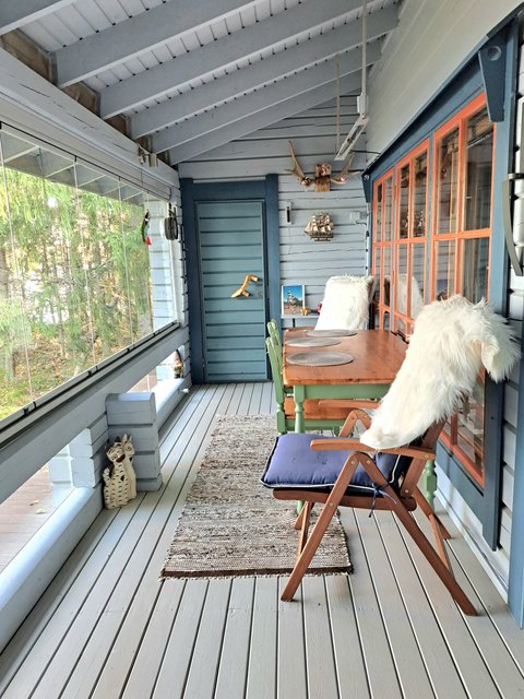 Mökissä on kolme makuuhuonetta, parvi, sekä sauna, jossa on perinteinen puukiuas ja ikkuna ulos. Saunan jälkeen voit rentoutua lasitetulla terassilla, jossa on infrapunalämmitin, ja nauttia kauniista maisemista.