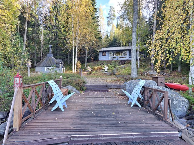 Pihapiiri on pääosin luonnonvaraisena säilytetty, mutta yläpihalta löytyy myös nurmialue, joka sopii mainiosti kesäpäivien viettoon. Lisäksi mökillä on neljä kylmää varastotilaa, joten säilytystilaa riittää hyvin.