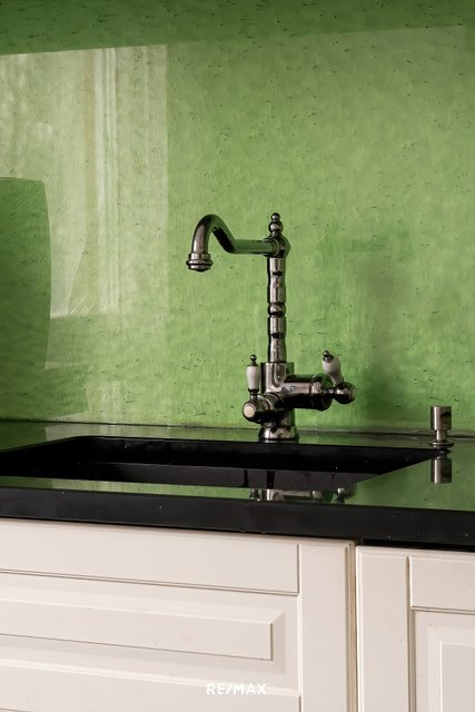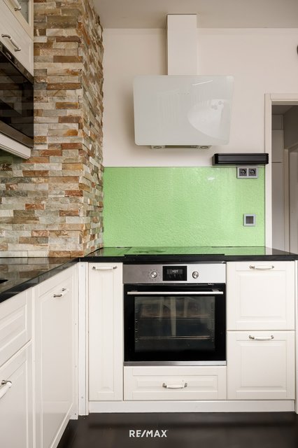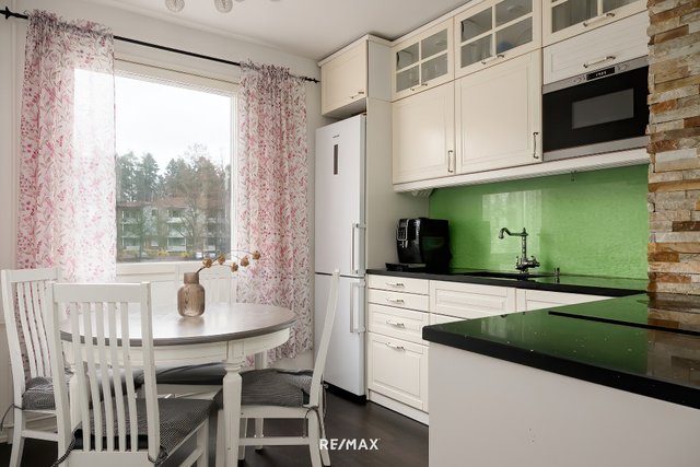 - Keittiössä on kivitaso, ja välitila on viimeistelty lasilla sekä verhoilukivellä