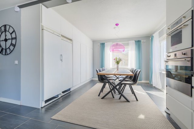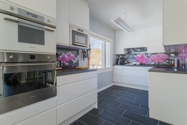 - Jääkaappipakastin (2 kpl), erillisuuni (höyryuuni 2017), liesi, liesituuletin (hormiin, 2020), astianpesukone (2020), ja mikroaaltouuni (2020)