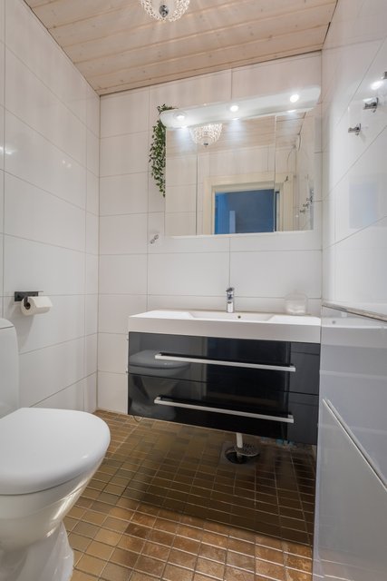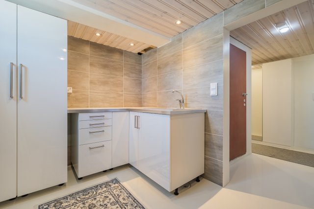 - Pesukoneliitäntä, lattialämmitys, pesuallas, lattiakaivo, pyykkikaapit, ja pöytätaso