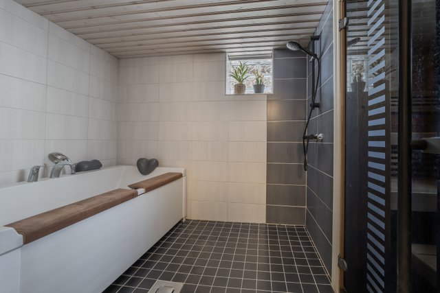 - Keskikerroksessa on vesikiertoinen lattialämmitys ja alakerrassa vesikiertoinen lattialämmitys kylpyhuoneessa, kodinhoitohuoneessa, saunassa ja käytävillä. Yläkerrassa vesikiertoinen patterilämmitys.