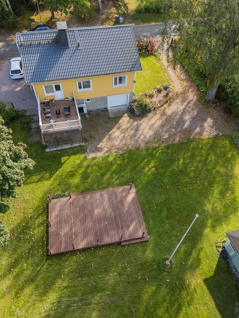 - Tasaista nurmipihaa, terassialue, huvimaja ja istutuksia