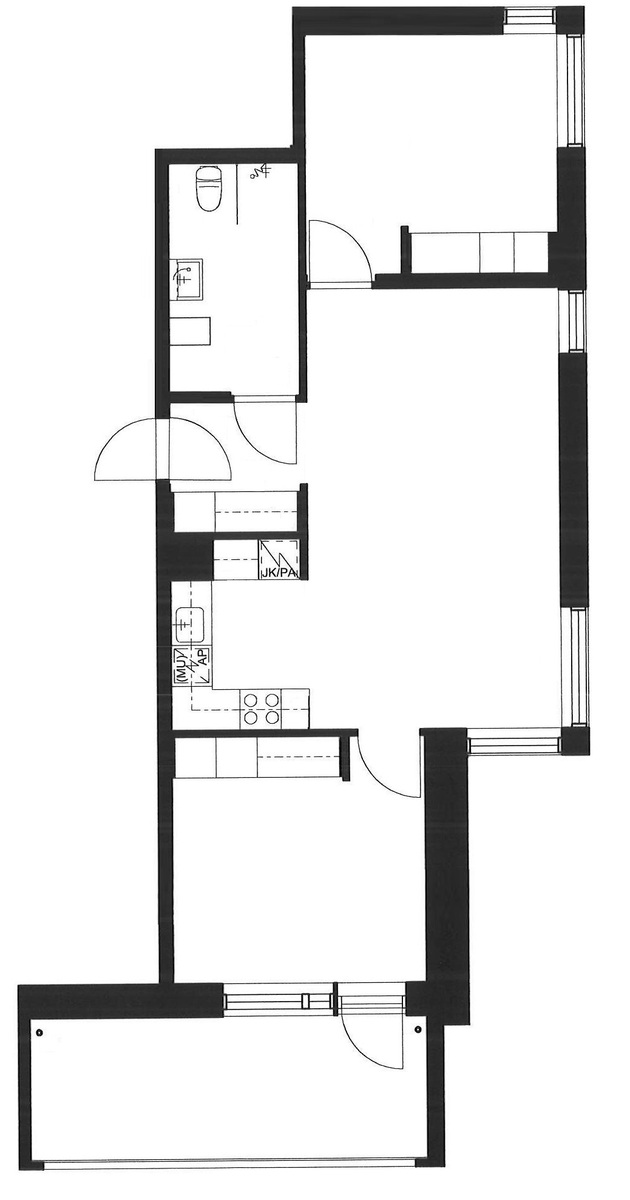 Olohuone on hyvänkokoinen ja valoa tulee asuntoon mukavasti kahteen ilmansuuntaan olevien ikkunoiden johdosta. Makuuhuoneet ovat tilavia ja niissä on säilytyskaappejakin valmiina. Toisen makuuhuoneen yhteydessä on lisäksi iso parveke.