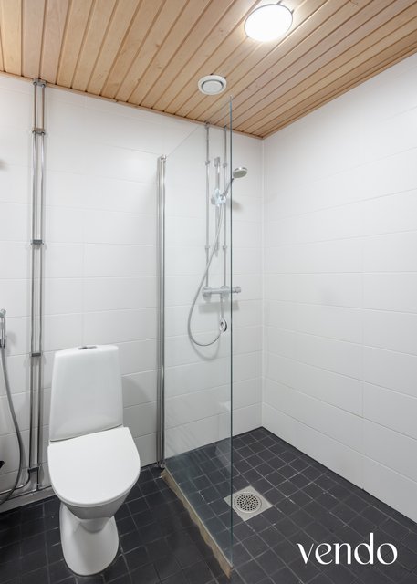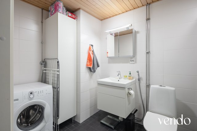 - WC-istuin, suihku, suihkuseinä, pesukoneliitäntä, pesuallas, peilikaappi, ja allaskaappi