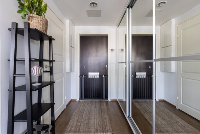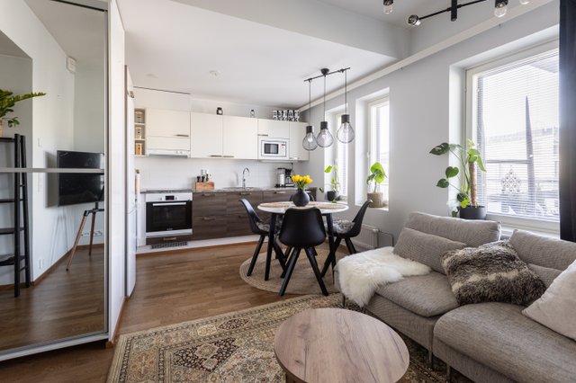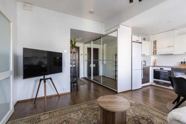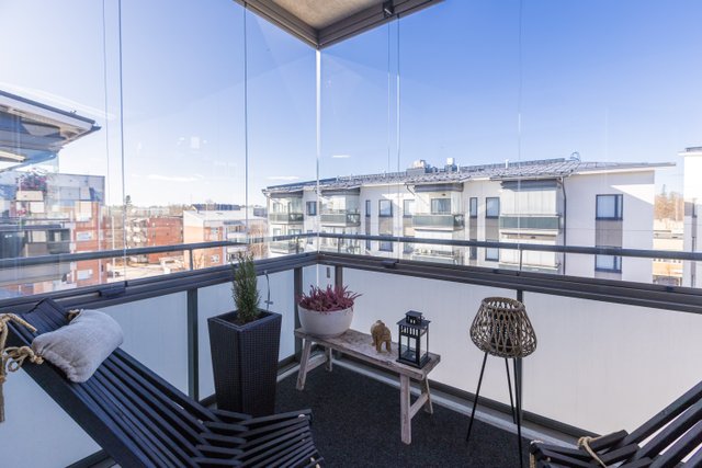 Asunnossa on moderni keittiö yhdistettynä olohuonetilaan, lasitettu parveke ilta-auringon suuntaan, moderni kylpyhuone ja oma sauna sekä liukuovilla varustetut säilytystilat eteisessä ja makuuhuoneessa.