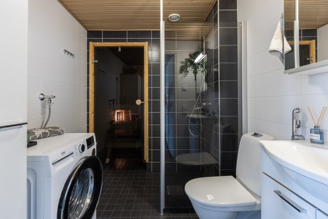 - WC-istuin, suihku, suihkuseinä, pesukoneliitäntä, lattialämmitys, pesuallas, peilikaappi, allaskaappi, ja bidee-suihku