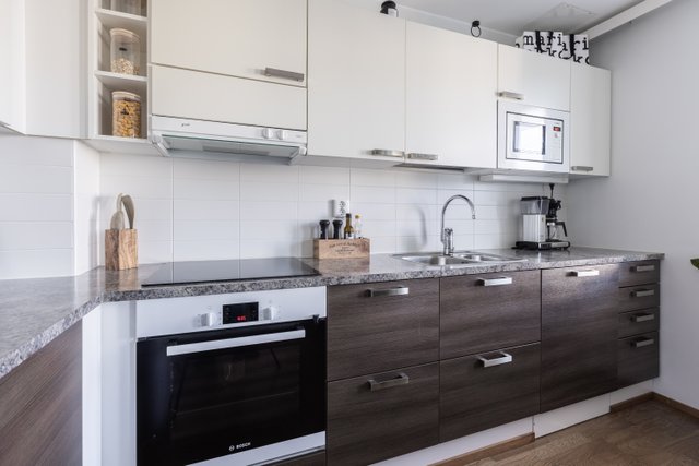 - Jääkaappipakastin, liesituuletin, erillisuuni, liesi, astianpesukone, ja mikroaaltouuni