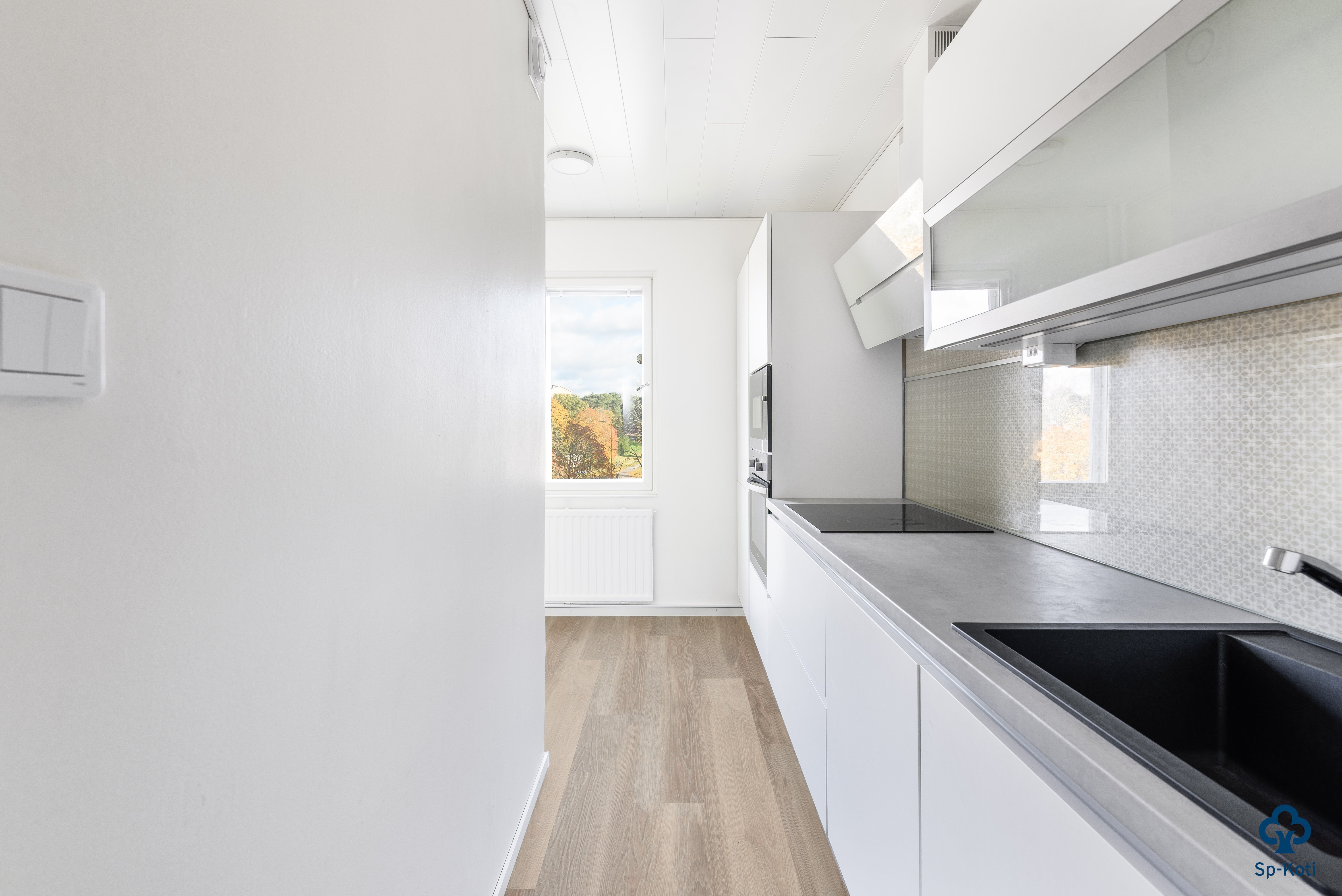 Kylpyhuone on remontoitu linjasaneerauksen yhteydessä – se on moderni, kompakti ja käytännöllinen. Kääntyvät suihkuseinät säästävät tilaa ja pesukoneelle on oma paikkansa. Keittiö on puolestaan remontoitu vuonna 2018, ja sen ajaton ilme palvelee vielä pitkään.