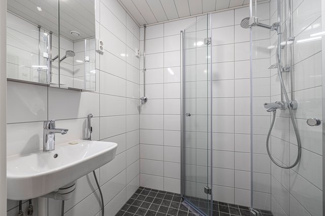 - WC-istuin, suihku, suihkuseinä, pesukoneliitäntä, lattialämmitys, peilikaappi, ja bidee-suihku