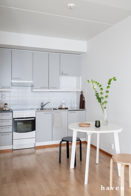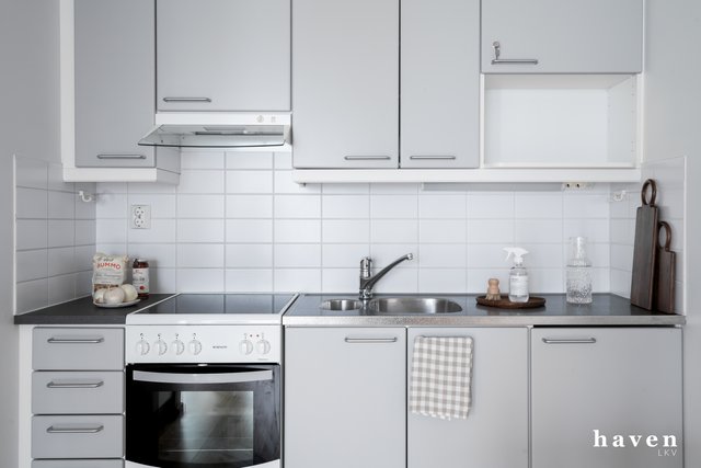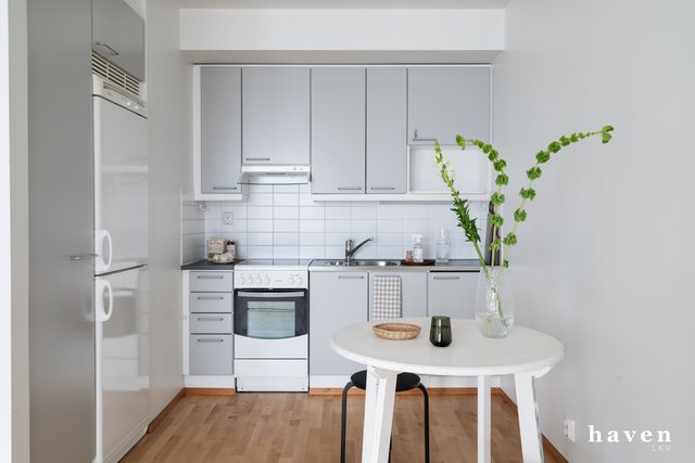 - Jääkaappipakastin, liesi, uuni, liesituuletin ja varattu paikka astianpesukoneelle.