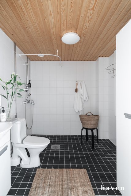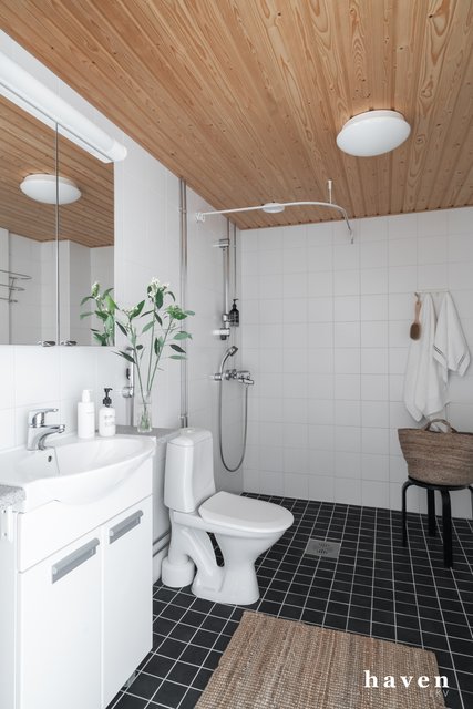 - Tilavassa laatoitetussa kylpyhuoneessa suihku, peilikaappi, kylpyhuonekaapisto, pesukoneliitäntä ja lattialämmitys.