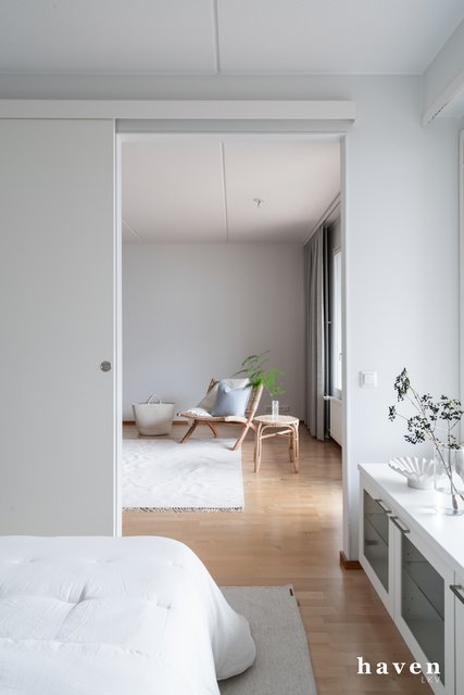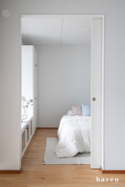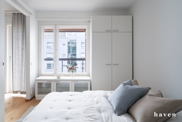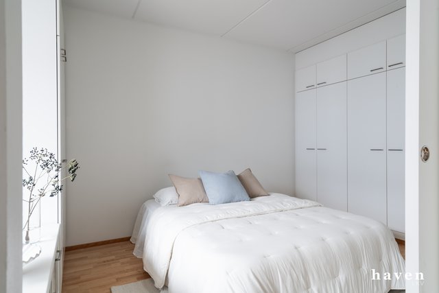 - Tilavassa makuuhuoneessa koko seinän levyinen kaapisto.