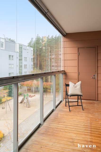 - Tilavasta olohuoneesta käynti isolle lasitetulle parvekkeelle.
