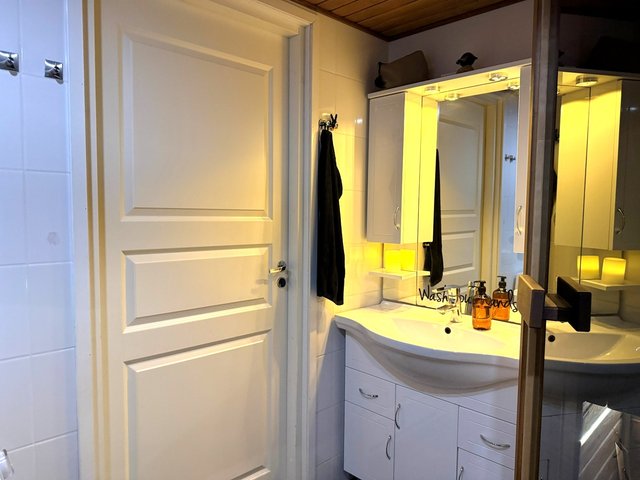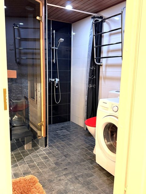 - Suihku, pesukoneliitäntä, lattialämmitys, ja peilikaappi