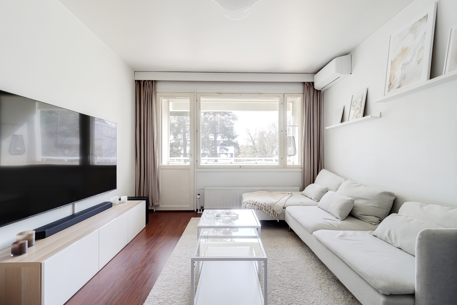 Keittiössä on tilaa, jossa nauttia aamiaista, yhdessä lounasta tai kokkailla, sekä hyvin kaappi- ja laskutilaa. Olohuone on valoisa ja ehjiä seiniä löytyy, joten kerrankin on vaihtoehtoja sisustaa! Lasitettu parveke on aurinkoinen, mutta ei huolta, asunnossa on ilmalämpöpumppu viilentämään kesällä! Myös makuuhuoneessa kokoa on sopivasti, siellä on perinteiset kaapistot ja eteisessä lisäksi vaatehuone. Kylpyhuone on riittävän kokoinen ja ikkuna tuo sinne luonnonvaloa.