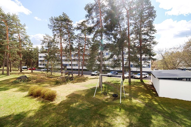 - Rauhallinen parvekenäkymä talojen väliselle, puistomaiselle yhteispihalle.