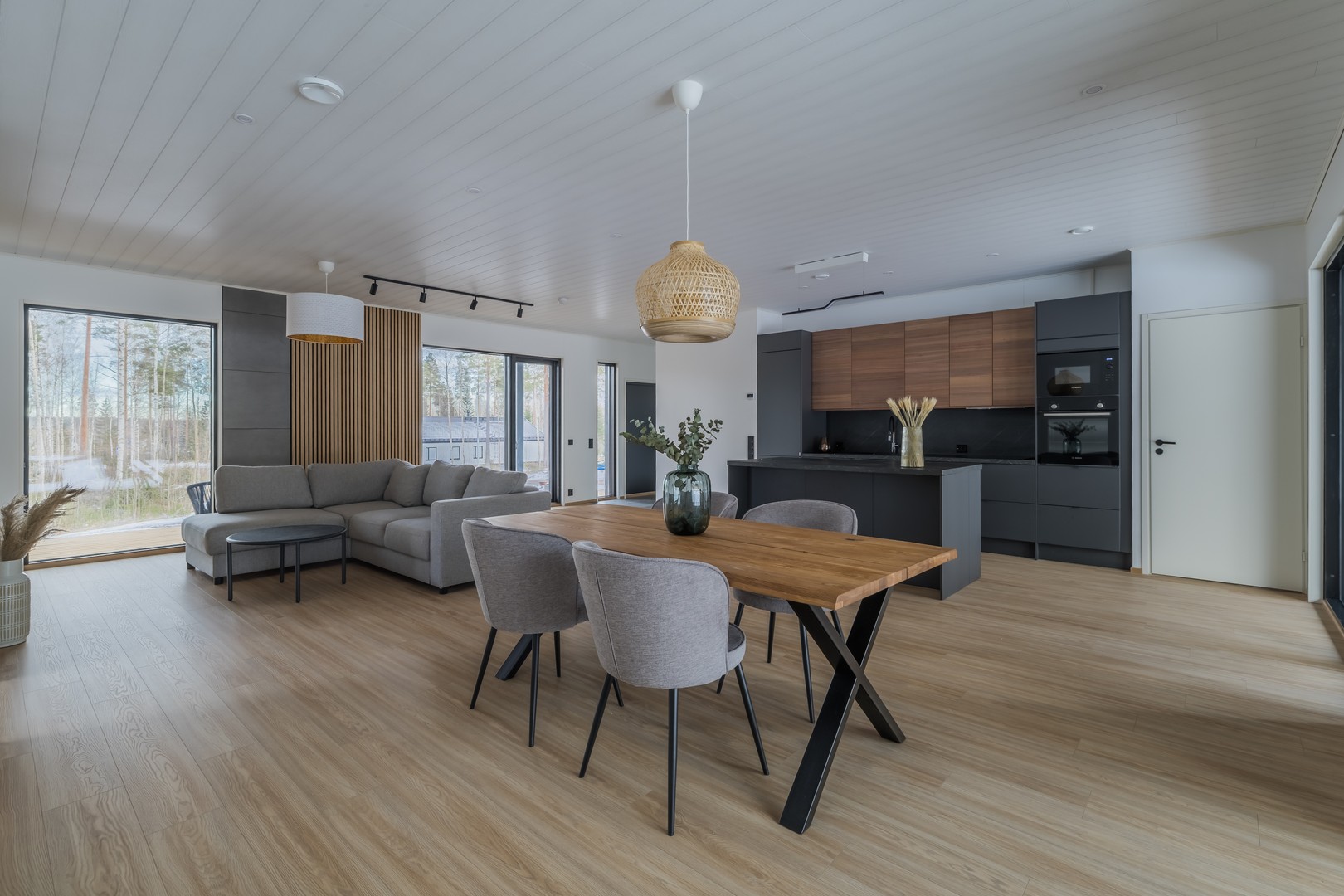 Tässä modernissa talossa on tyylikäs saarekkeellinen Epoq-keittiö, tehosteena rimapaneeliseiniä, kaunis sävymaailma ja halutessasi kaikki kalusteetkin kuuluvat kauppaan.
