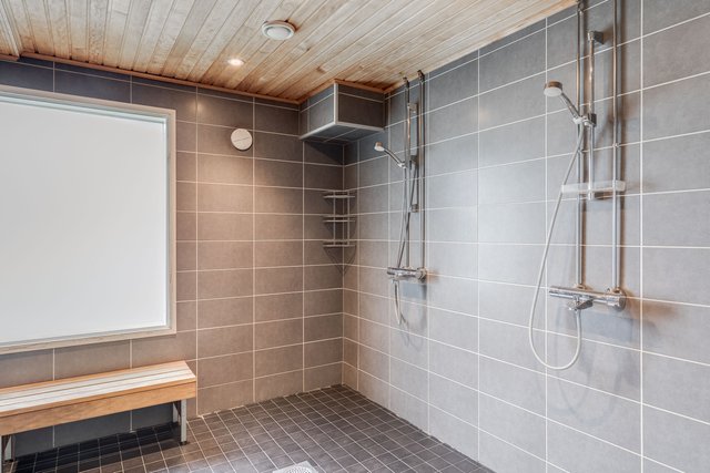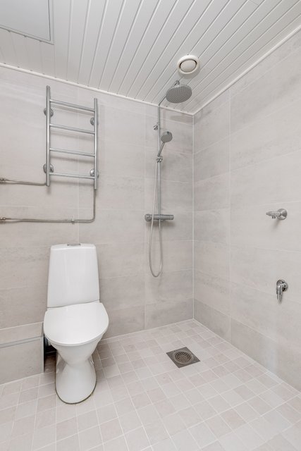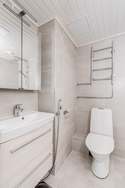 - WC-istuin, suihku, pesukoneliitäntä, pesuallas, allaskaappi, ja peilikaappi