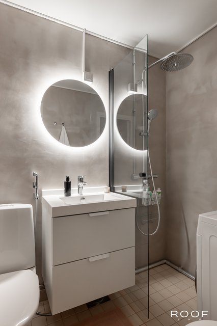 - VARUSTUS: Suihku, suihkuseinä, wc istuin, pesukoneliitäntä, hana, allas, allaskaapisto, GROHE sadesuihku. SEINÄT: Mikrosementoitu. LATTIAT: Laatta.