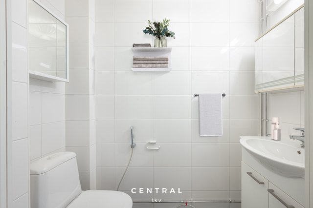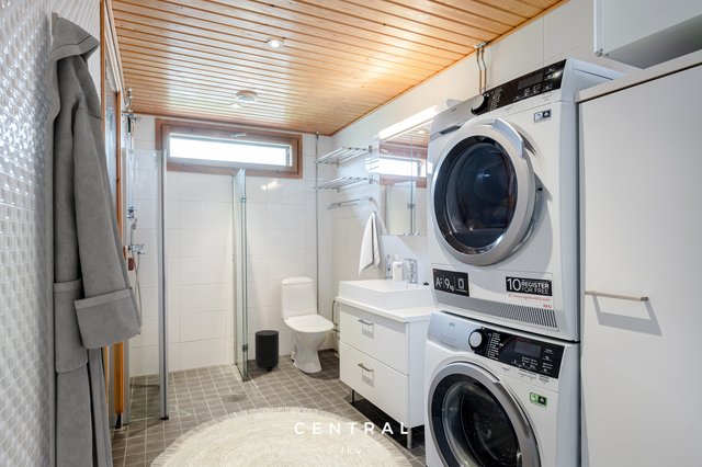 - WC-istuin, suihku, pesukoneliitäntä, suihkuseinä, peilikaappi, allaskaappi, pesuallas, bidee-suihku, lattialämmitys, ja säilytyskaappi