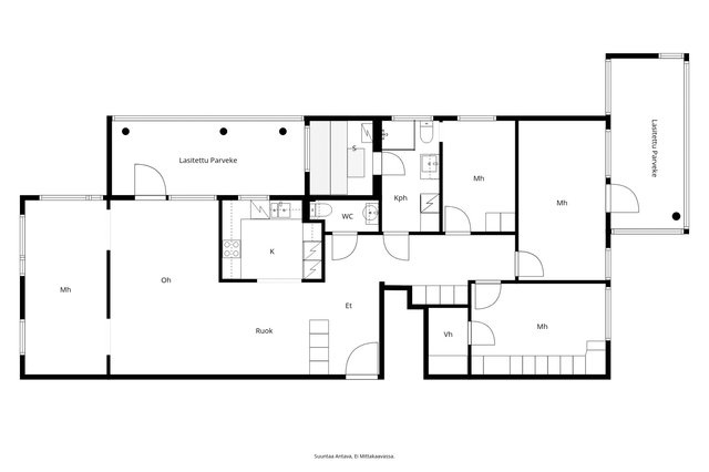 - Erillinen keittiö, jonka vieressä olohuoneen yhteydessä oleva ruokailutila.