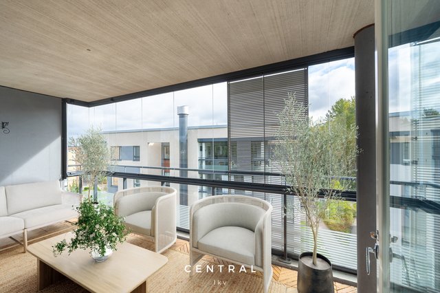Ylimmän kerroksen valoisa päätyhuoneisto kahdella isolla lasitetulla terassiparvekkeella.