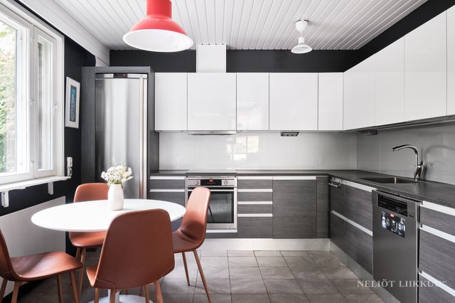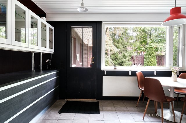 - Avara ja toiminnallinen keittiö, jossa saareke tarjoaa runsaasti työskentely- ja seurustelutilaa kotikokille. Keittiöstä avautuu kätevästi suora kulku omalle takapihalle – täydellinen yhdistelmä arjen helppoutta ja viihtyisyyttä.