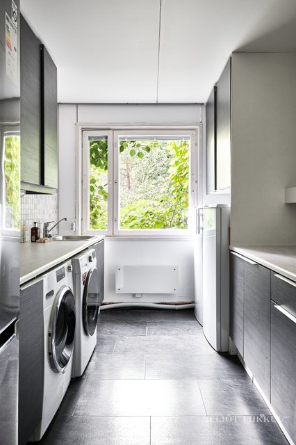 - Käytännöllinen kodinhoitohuone, jossa reilusti laskutilaa ja selkeästi sijoitetut paikat kodinkoneille, arjen askareet hoituvat sujuvasti ja vaivattomasti.