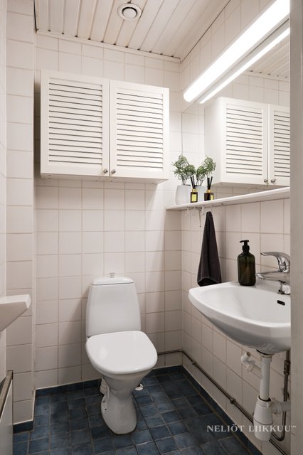 - Myytävä kohde koostuu kahdesta asunnosta ja kolmesta osakesarjasta: huoneisto B (7h+keittiö+saunaosasto+varasto+autotalli), pinta-ala 286,5 m², osakkeet 401-1311, huoneisto C (1h+keittokomero), pinta-ala 22 m², osakkeet 1312-1412 ja autotalli 1, pinta-ala 16,5 m², osakkeet 373-401. Ullakkotilan rakentamiseen ei ole haettu rakennuslupaa eikä se täytä välttämättä kaikilta osin lain vaatimuksia. Ei tarkistusmitattu, joten pinta-alatietoihin liittyy oleellinen epävarmuus. Pinta-alat voivat siis olla edellä mainittua pienempi tai suurempi. Huoneiston 2 ilmoitettu pinta-ala sisältää kaikki tilat, ml uima-allasosasto. YJ:n mukaan pinta-ala 286,5 m², josta vähennetty autotalli ja varasto n. 30 m²