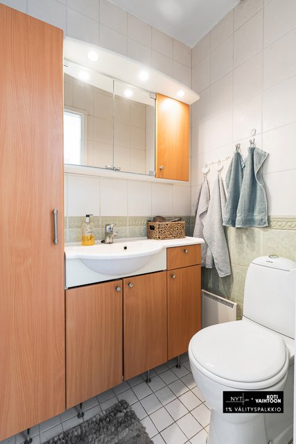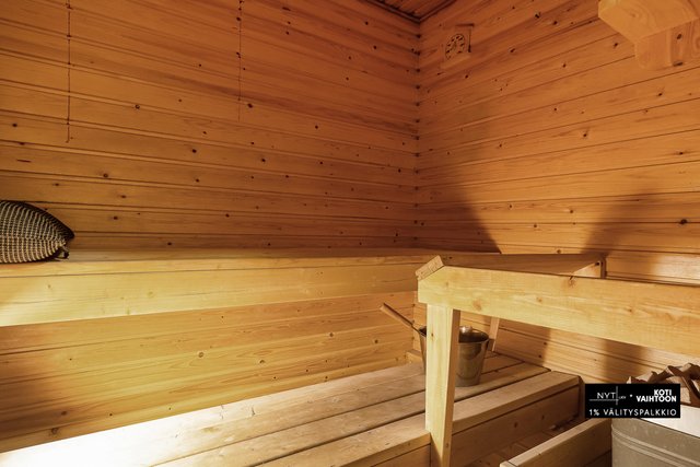 Kylpyhuoneeseen on kulku pienen pukeutumistilan kautta, johon mahtuu vaikka työnurkkaus tai lisää kaappitilaa. Kylpyhuone on alkuperäiskuntoinen mutta siisti ja toimiva. Huoneessa hyvä tila pesukoneelle. Asunnossa myös arkielämään vivahdetta tuova oma sauna. Vessa on erillinen ja varusteltu hyvin kaappitiloin.