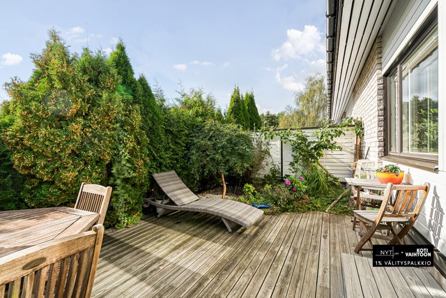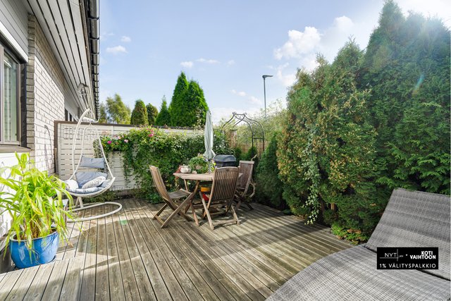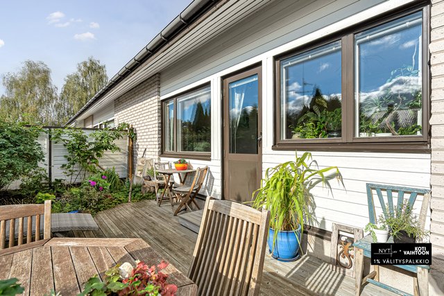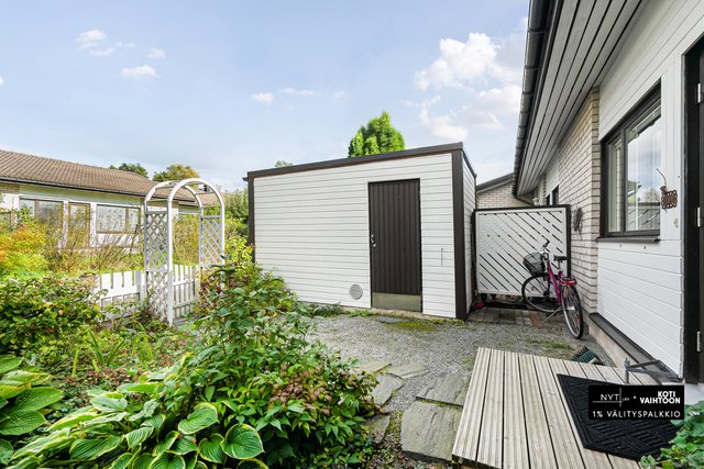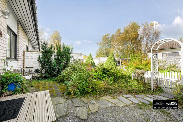 Asunnon pihaan mahtuu paljon istutuksia kuten karhunvatukkaa, vadelmaa, metsämansikkaa ja hunajamarjaa, sekä kauniisti kesäkuussa valkeaa kukkiva helmipensas. Suojaisalla, kuitenkin koko kesäpäivän aurinkoisella takapihalla sijaitsee terassi, johon mahtuu ruoka-/oleskeluryhmä hienosti. Etupihalla asunnon ulkovarasto.