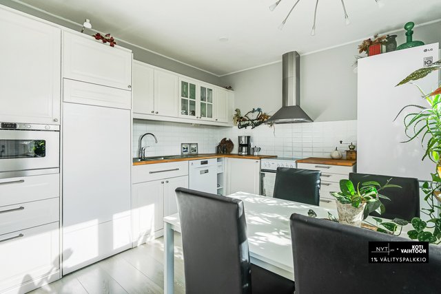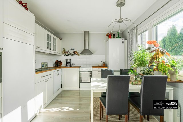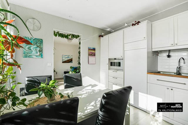 Asunnon keittiö on nykypäivän vaatimustasot täyttävä kokonaisuus. Keittiöön mahtuu hyvin ruokaryhmä ja huoneesta on kulku asunnon terassille.