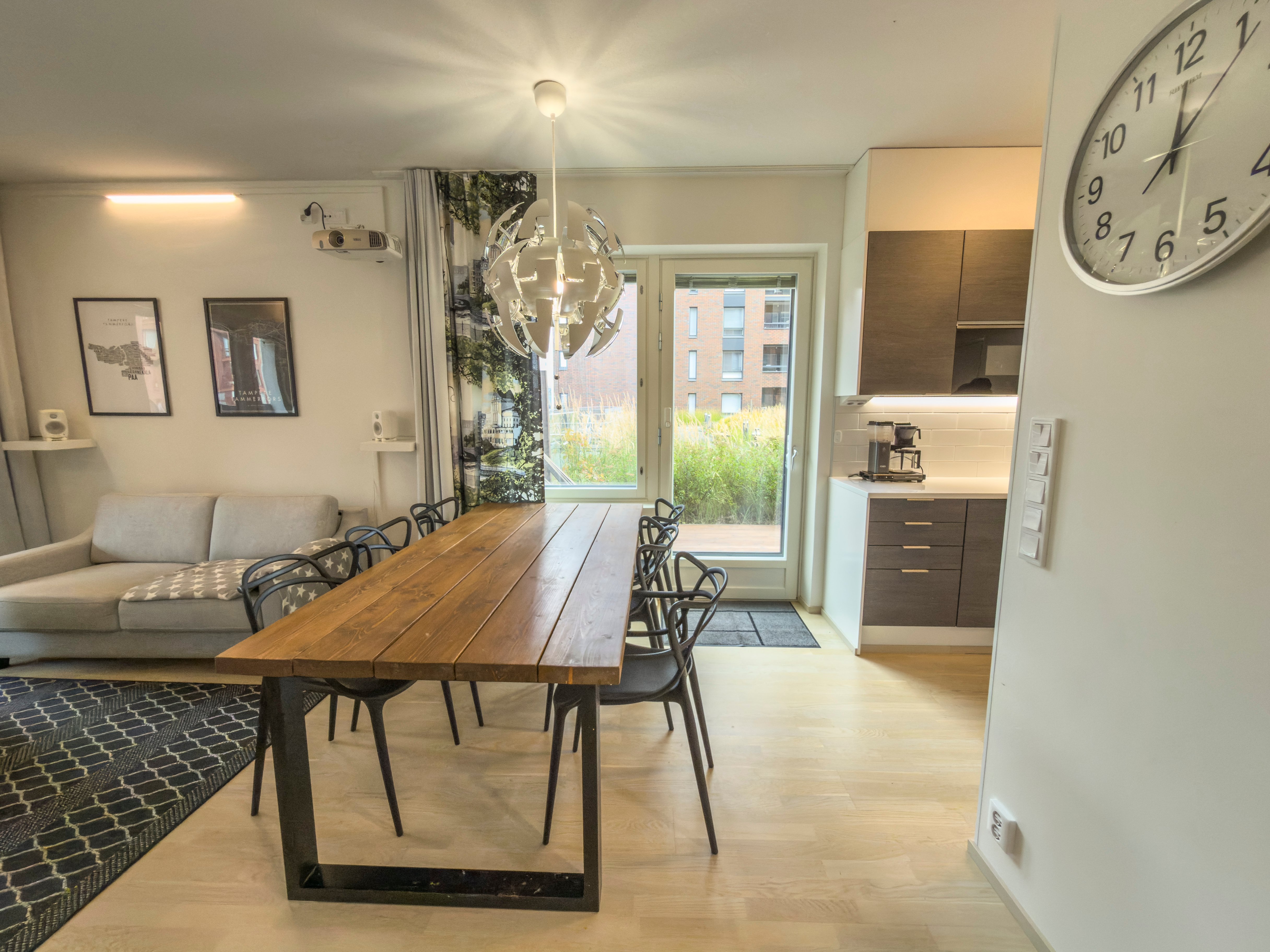 Asunnon moderni keittiö on varusteltu integroiduilla kodinkoneilla ja kvartsikomposiittitasoilla, ja tilavasta olohuoneesta on käynti sekä parvekkeelle että pienelle pihaterassille. Kaksi makuuhuonetta tarjoavat rauhalliset puitteet, ja suuremmassa makuuhuoneessa on runsaasti kaappitilaa. Asunnon sauna ja kylpyhuone ovat korkeatasoisesti varusteltuja, ja erillis-WC:ssä on kodinhoitotilaa pyykinpesukoneelle ja kuivausrummulle.