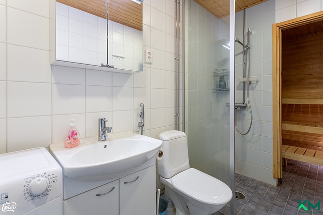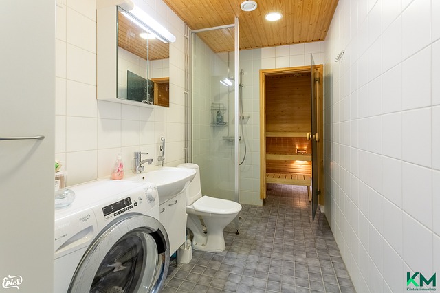 - Suihku, peilikaappi, wc-istuin, pesukoneliitäntä, suihkuseinä, ja kiinteät valaisimet
