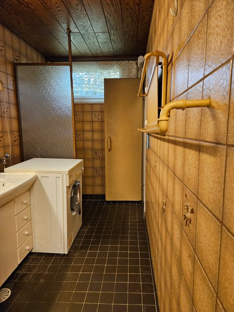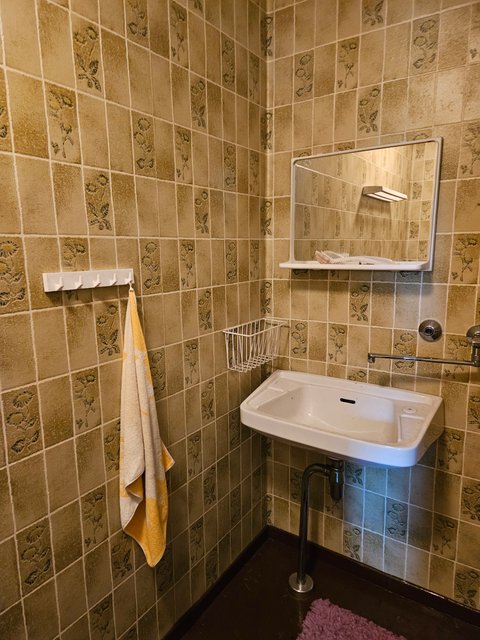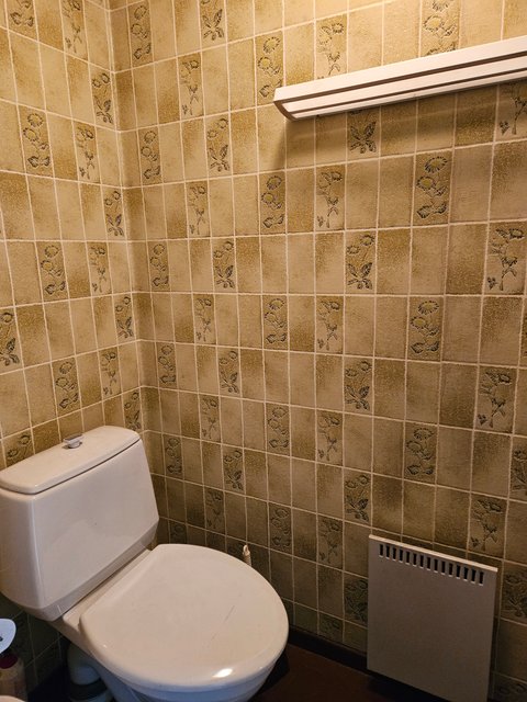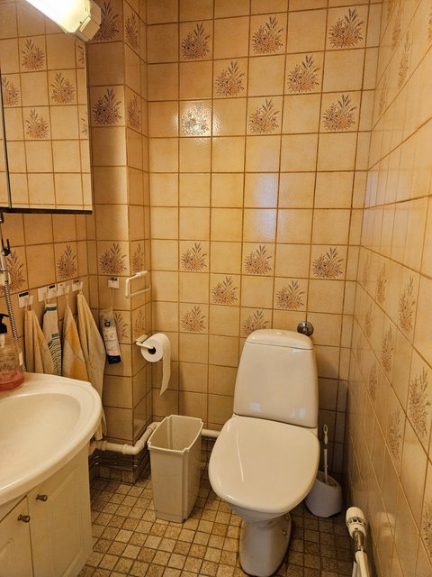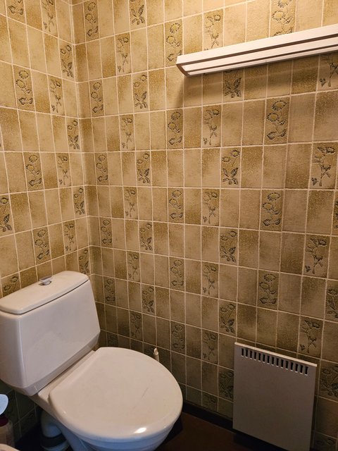 - Alkuperäisellä osalla WC: lattia laattaa, seinät kaakelia, vesikiertoinen patterilämmitys, allaskaappi, peilikaappi, bideesuihku. Laajennusosan WC: seinät ja lattia muovimattoa, sähköpatteri, peili. Vain kylmä vesi.