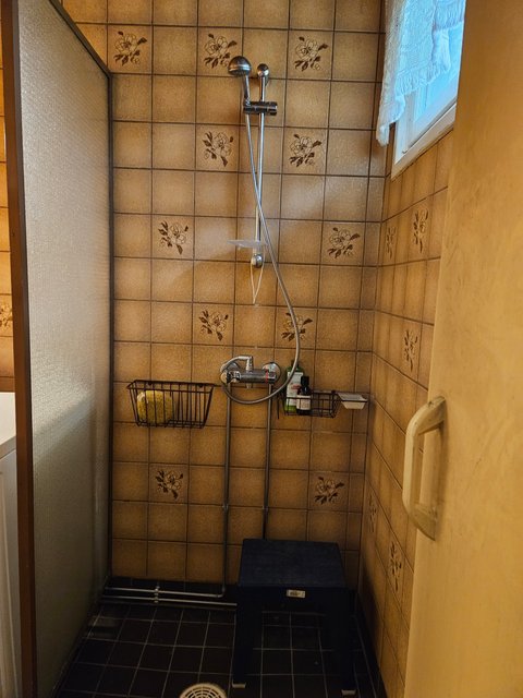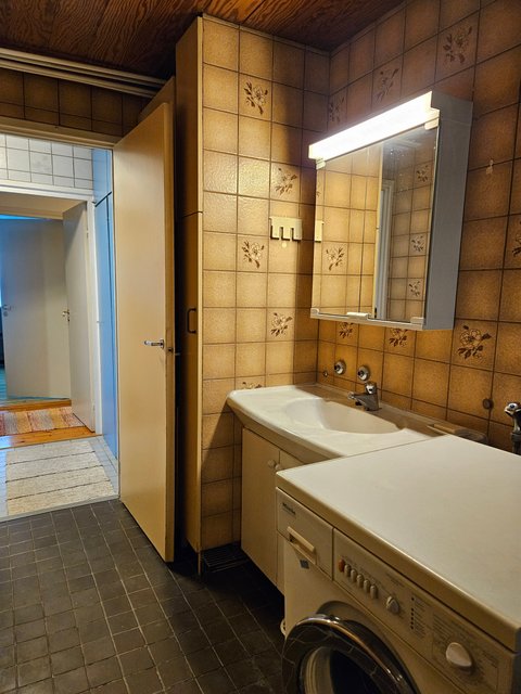 - Suihku, suihkuseinä, lattialämmitys, allaskaappi, pesuallas, peilikaappi, ja pesukoneliitäntä
