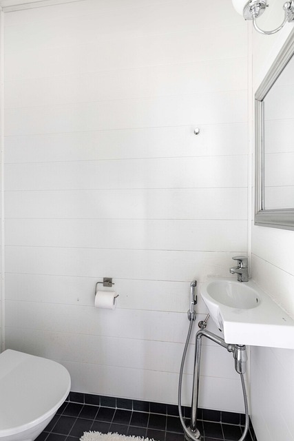 - Khh yhteydessä olevan pikku vessan seinät paneloitu, wc-istuin, bideesuihku, peili ja valaisin.
