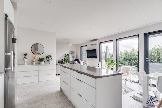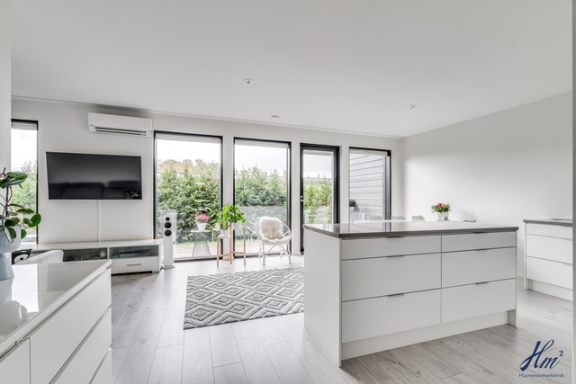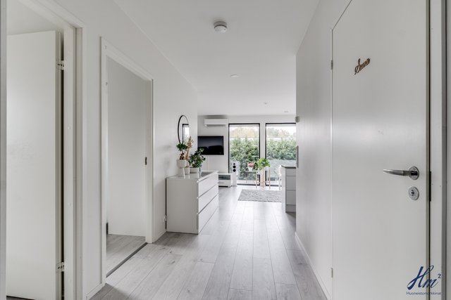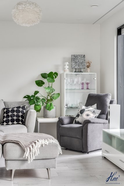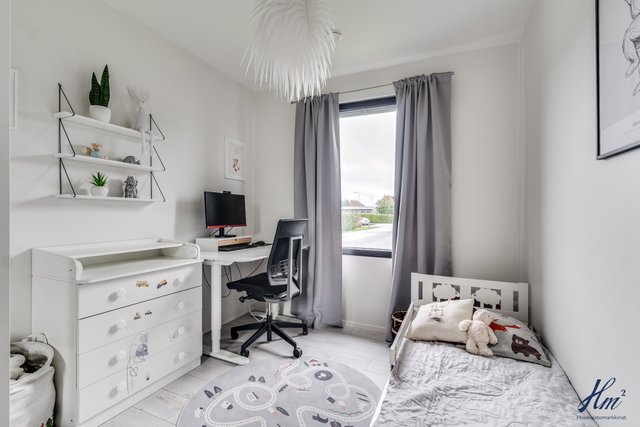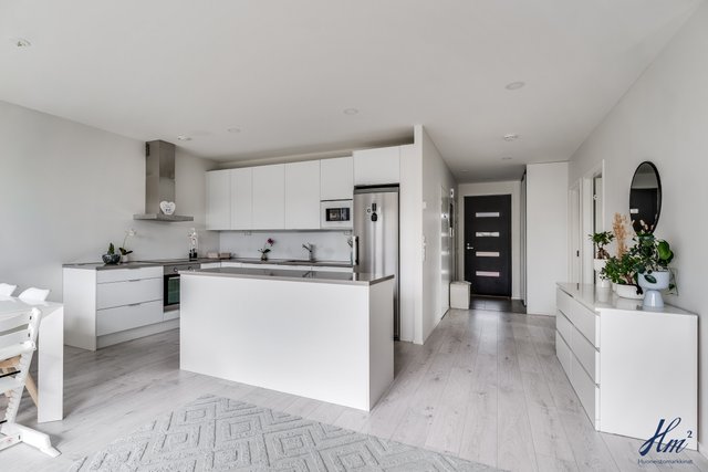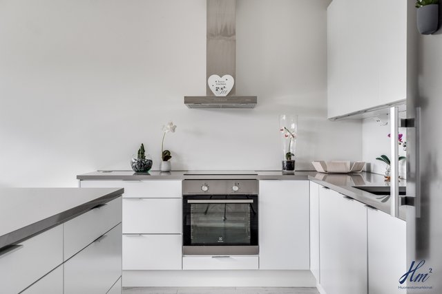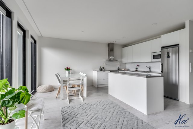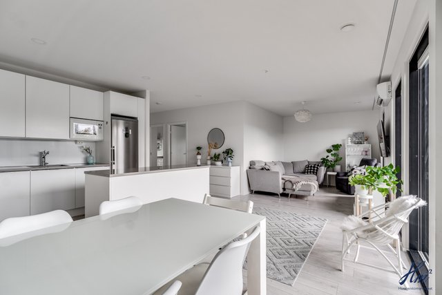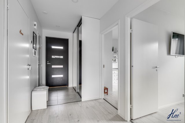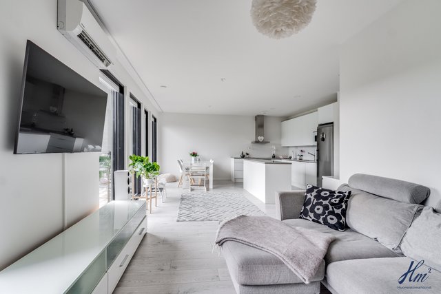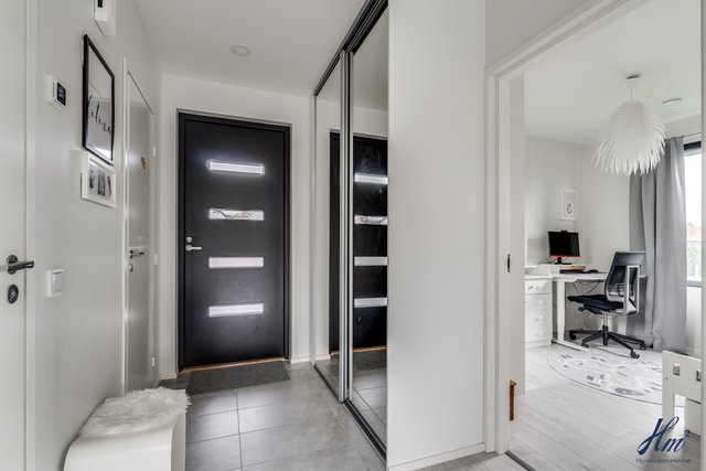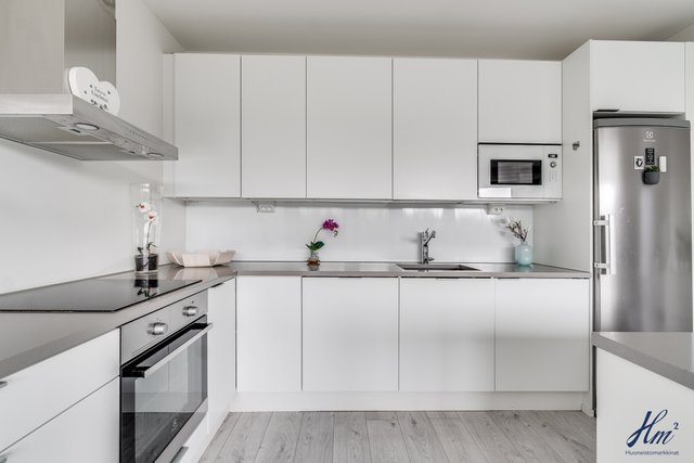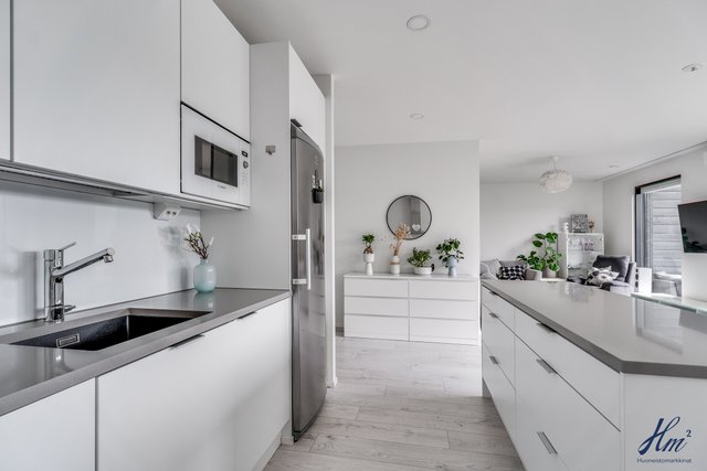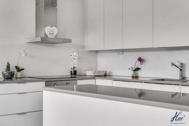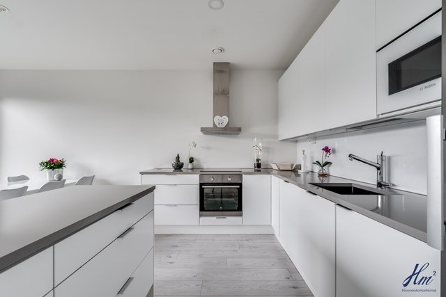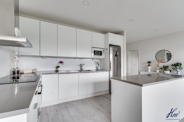 Asunnon avokeittiö on varusteltu laadukkaasti, ja tilaa hallitsee saareke kvartsikomposiittitasolla. Olohuoneen himmennettävä Led-valaistus luo tunnelmaa iltoihin. Kaksi makuuhuonetta tarjoavat rauhalliset puitteet levolle, ja kylpyhuoneen yhteydessä oleva kodinhoitotila tekee arjesta sujuvaa.