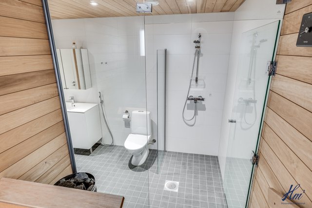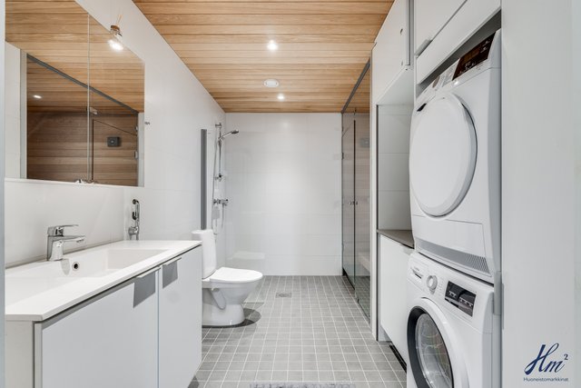- Suihku, pesukoneliitäntä, pesuallas, peilikaappi, wc-istuin, bidee-suihku, ja lattialämmitys