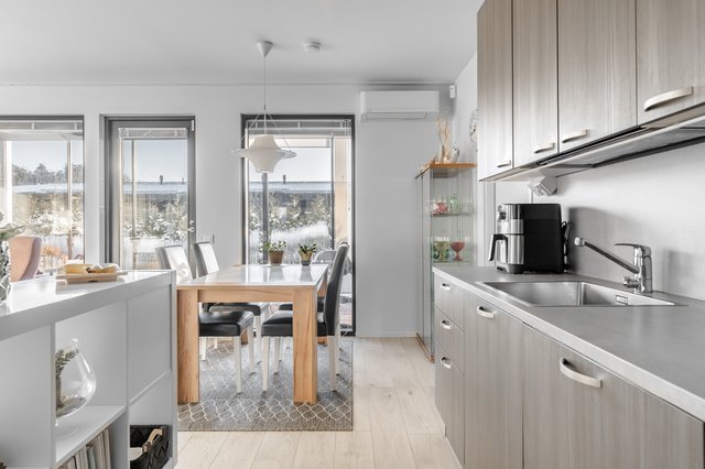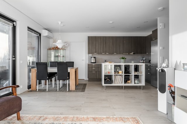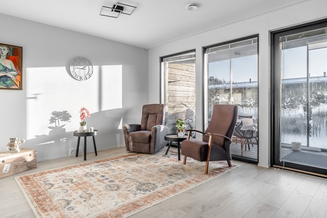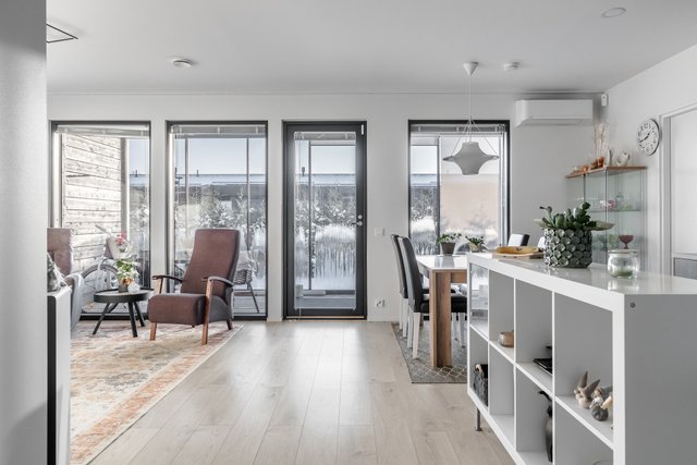 Pinnat ovat siistit ja ajanmukaiset – asunto on muuttovalmis ilman remonttihuolia. Lasitettu takaterassi toimii lisähuoneena pitkälle syksyyn ja tarjoaa suojaisan paikan rentoutumiseen ja viilentävä ilmalämpöpumppu viilentää kesäpäivinä.
