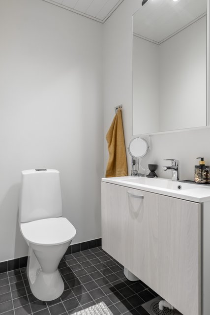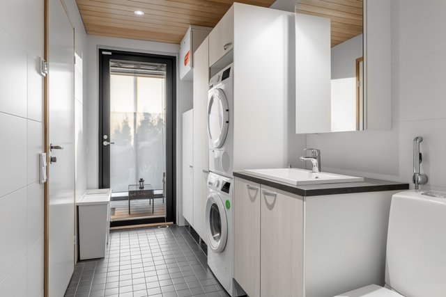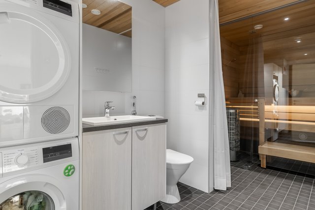 - WC-istuin, suihku, pesukoneliitäntä, peilikaappi, pesuallas, allaskaappi, bidee-suihku, ja pyykinpesukone ja kuivausrumpu