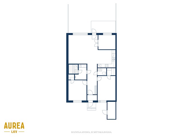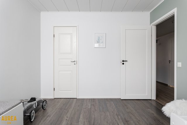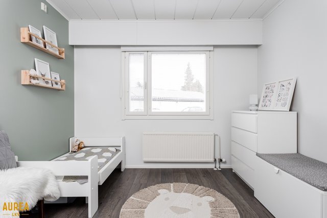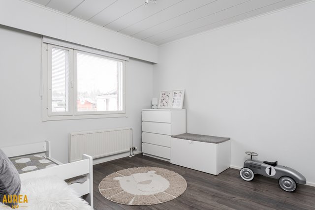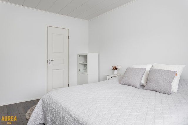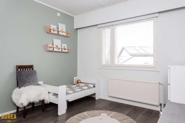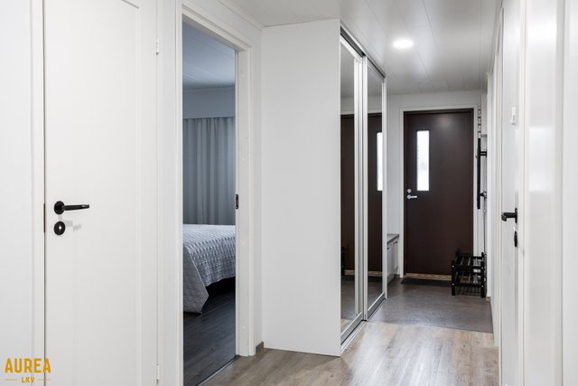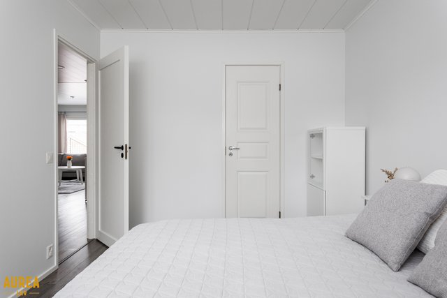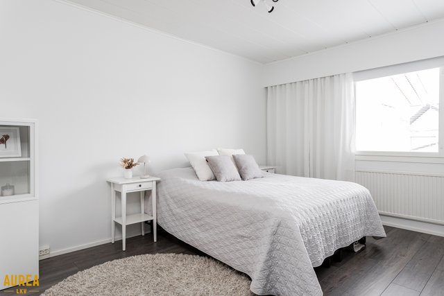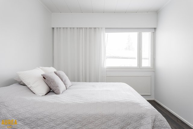 - Kaksi makuuhuonetta joissa vaatehuone. Olohuoneen yhteyteen rakennettu kolmas makuuhuone. Seinät: maali, lattia: laminaatti/vinyylikorkki, katto: mdf.